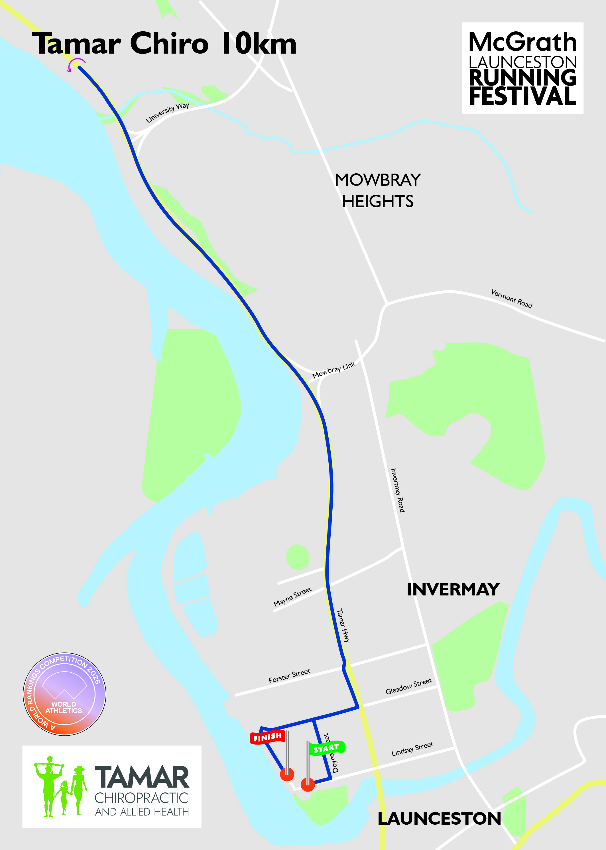 Starting outside the Peppers Silo Hotel, the 10km kicks off with a fast, flat stretch followed by a 90 degree left hand turn into Doyne Street. Runners will head onto Gleadow St then the course joins the East Tamar Highway.